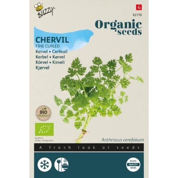 Buzzy Organic Kervel Fijne Krul BIO: biologisch keukenkruid met fijn gekruld blad en zachte anijssmaak. Zaaien mrt.–aug., oogst apr.–okt.