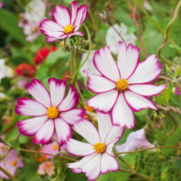 Cosmos Picotee is een sierlijke, rijkbloeiende eenjarige met grote witte bloemen die zijn afgezet met een opvallende roze tot karmijnrode rand. Dit unieke tweekleurige effect geeft de plant een elegante en speelse uitstraling in borders en bloemrijke perken. Het fijne, geveerde blad zorgt voor een luchtig geheel en laat de bloemen mooi tot hun recht komen.