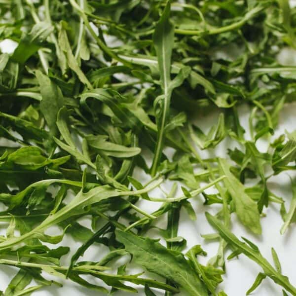 Rucola Eruca sativa van Douma Zaden: snelgroeiende, pittige bladgroente voor salades, pesto en roerbak. Zaaien mrt.–sep., oogst apr.–okt.