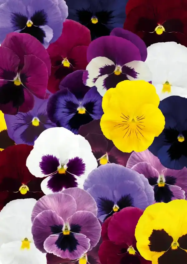 Violen Mix: kleurrijke, grootbloemige eenjarige violen voor borders, bakken en vensterbanken. Zaaien feb.–mei, bloei mrt.–jul., hoogte 10–20 cm.