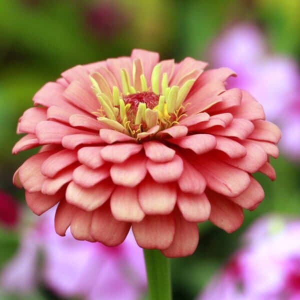 Zinnia Salmon Queen is een elegante, rijkbloeiende eenjarige met grote, dahlia-achtige bloemen in een unieke zalmroze tint. De bloemen staan stevig op lange stelen en geven een warme, zachte uitstraling aan borders en bloemrijke perken. Dankzij de stevige groei en lange stelen is deze zinnia ook uitstekend geschikt als snijbloem.